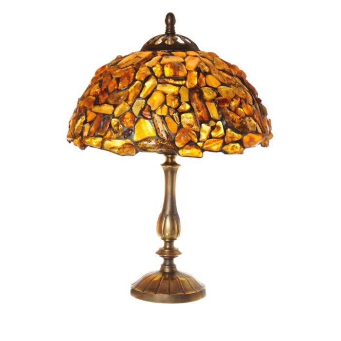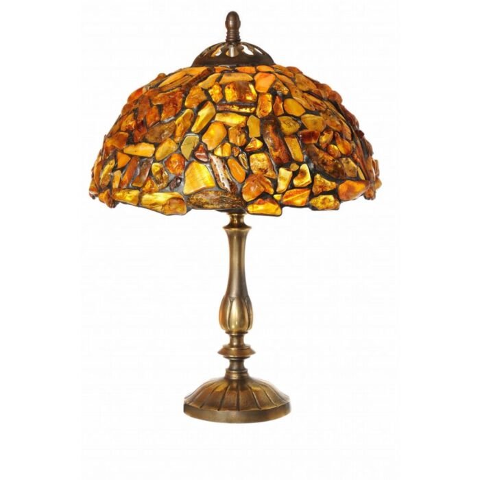 This exquisite lamp is crafted using the stained glass method, showcasing the natural beauty of Baltic amber. The 25 cm diameter lampshade, made from carefully selected amber pieces, is mounted on a polished brass base, adding a sophisticated touch to any room. The lamp emits a warm and relaxing light, perfect for creating a cozy ambiance in your home.