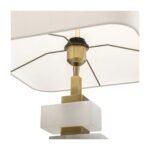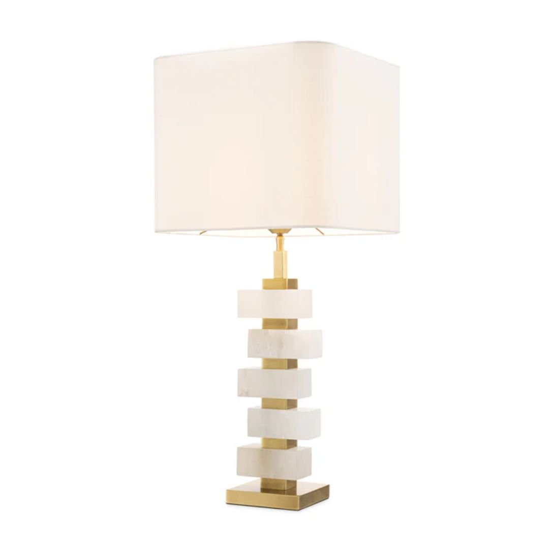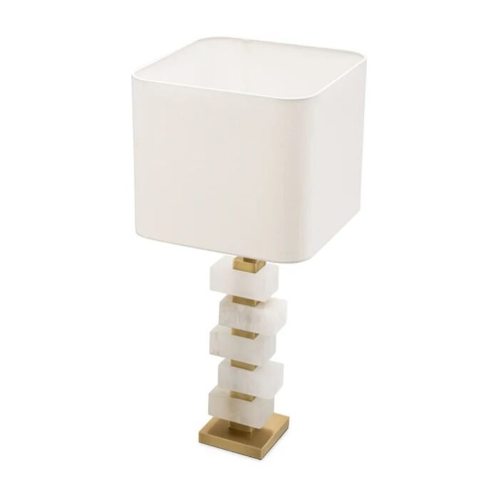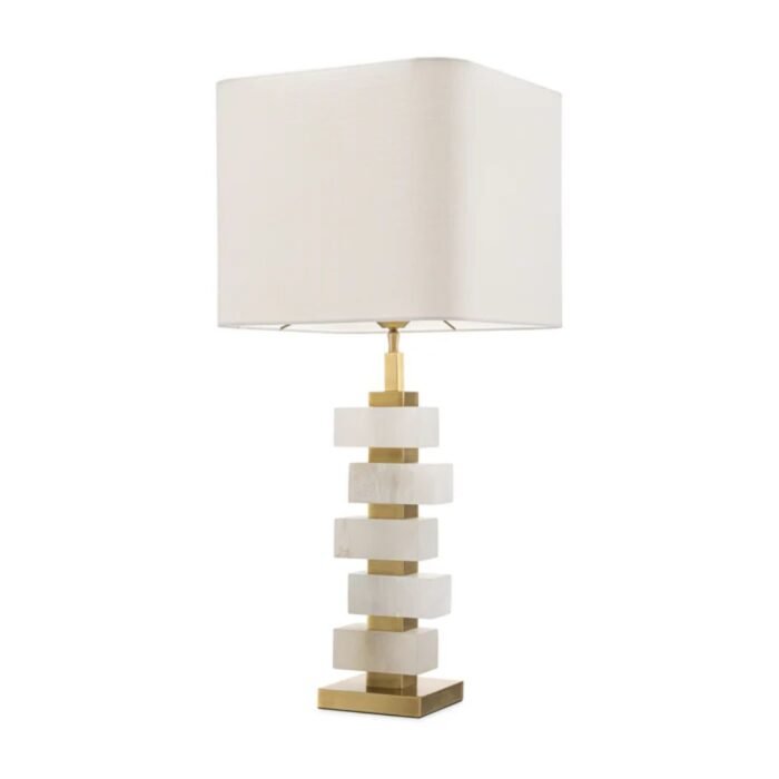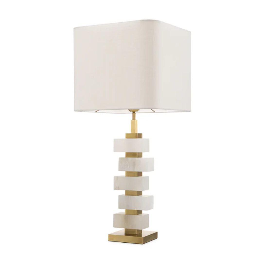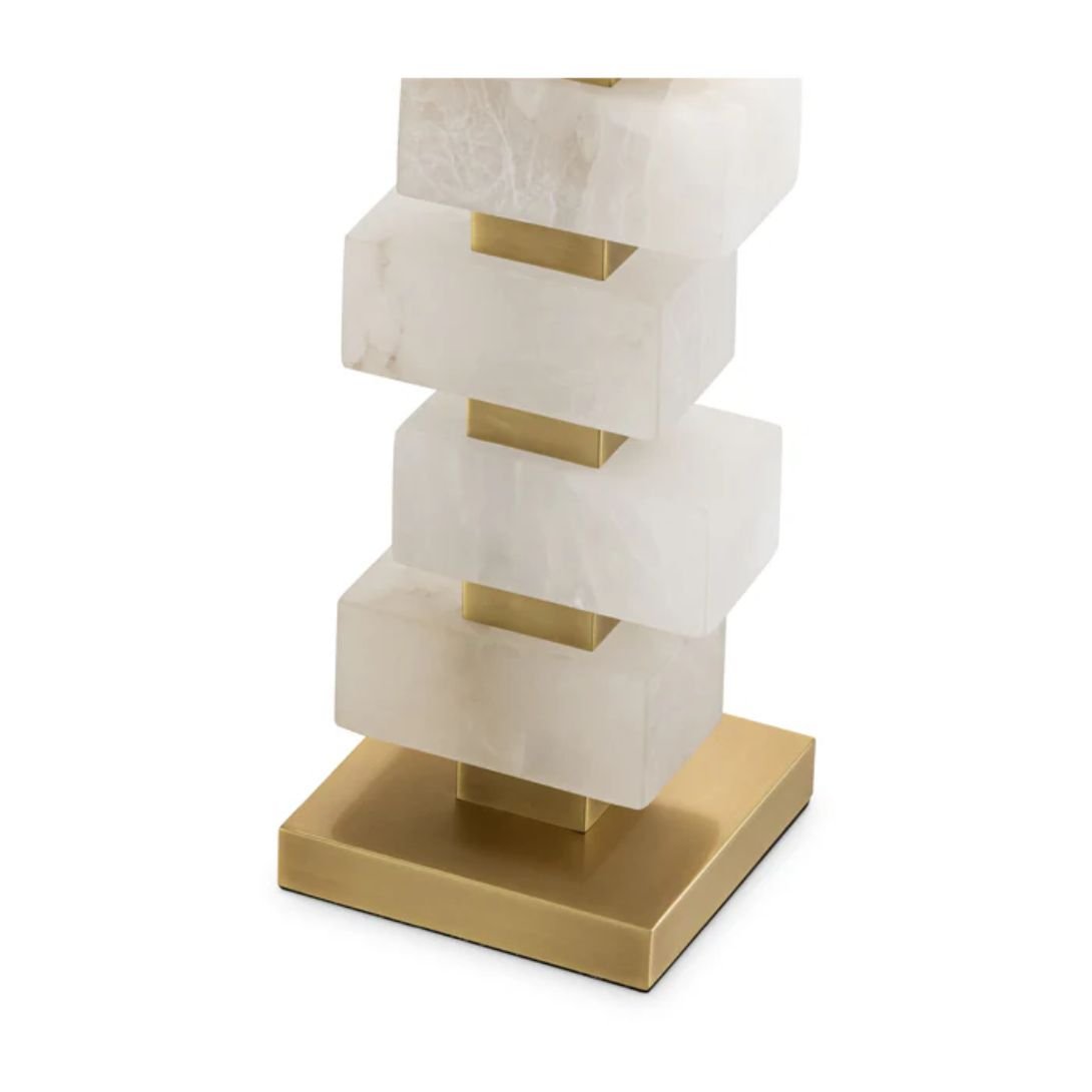 Featuring a base finished in antique brass, the lamp is beautifully accented with blocks of alabaster, lending natural texture and timeless appeal. The design is completed with an off-white fabric shade, which softens the light and harmonizes effortlessly with a variety of interior styles.