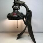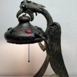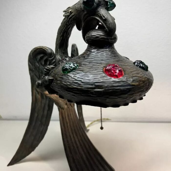 The lamp features a fierce, mythical griffon-dragon, cast in solid bronze with detailed wings, claws, and scales that evoke strength and power. Each curve and line reflects the flowing, organic design typical of Art Nouveau styling. Embellished with vibrant chunk glass “jewels”, the lamp glows with a rich mosaic of color when lit, casting magical reflections that transform any room into a gothic fairytale.