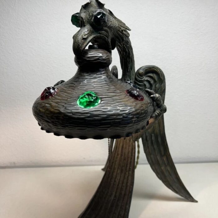 ANTIQUE ART NOUVEAU JEWELLED CHUNK GLASS AUSTRIAN BRONZE GRIFFON DRAGON LAMP