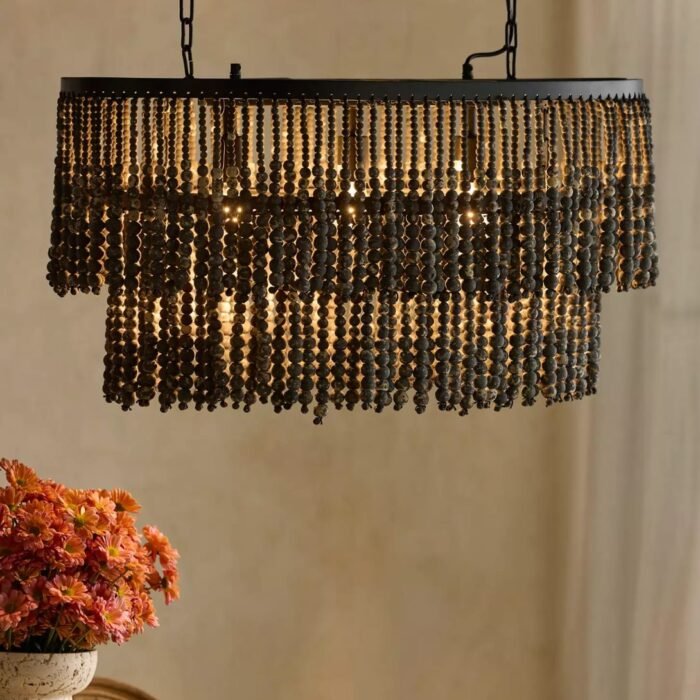 Elevate your space with this hand-strung mango wood chandelier—a breathtaking focal point that marries rustic elegance with curated design. Its sculptural shape and natural materials create a warm, welcoming atmosphere with an artistic twist.