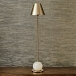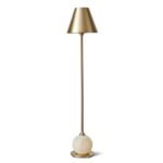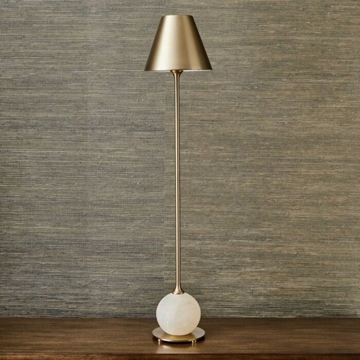 This sophisticated lamp features a slim satin brass empire shade perched atop a long, slender neck adorned with elegant trumpet-shaped ends. The neck gracefully transitions into a polished alabaster sphere, which rests on a matching satin brass plate with feet, creating a balanced and luxurious silhouette.