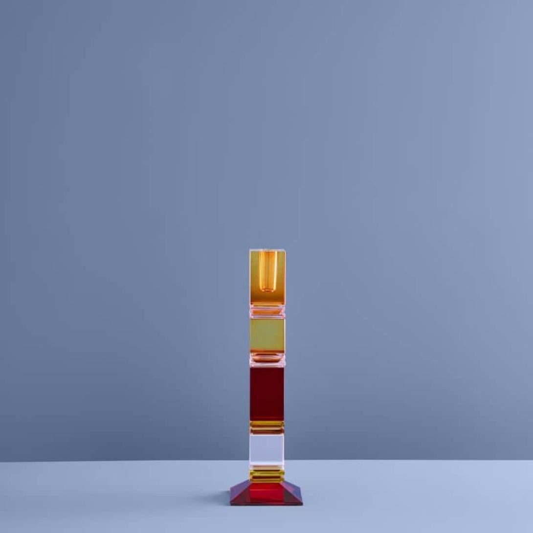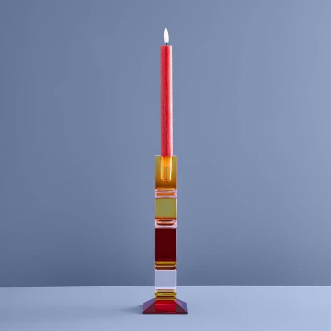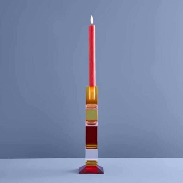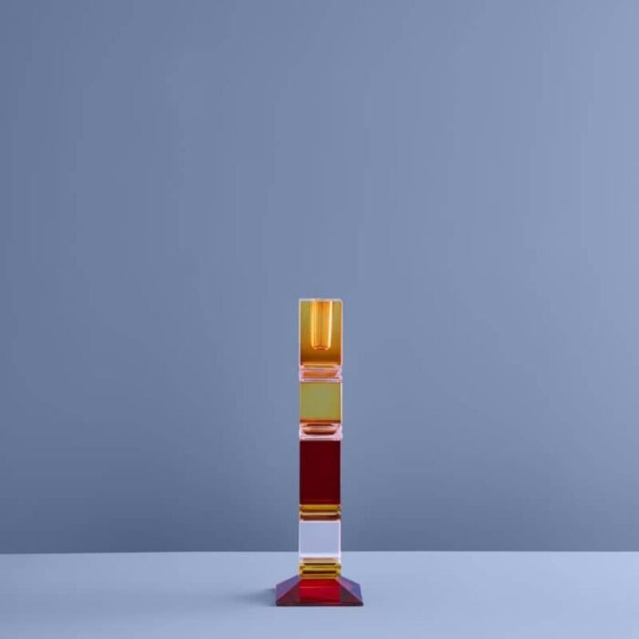 Crafted from high-quality glass, this candle holder features a unique multicolored design that beautifully reflects candlelight in a dazzling array of hues. Each angle reveals a different play of color, adding visual interest and charm to your space. The elegant, modern shape pairs beautifully with both minimalist and maximalist interiors.