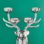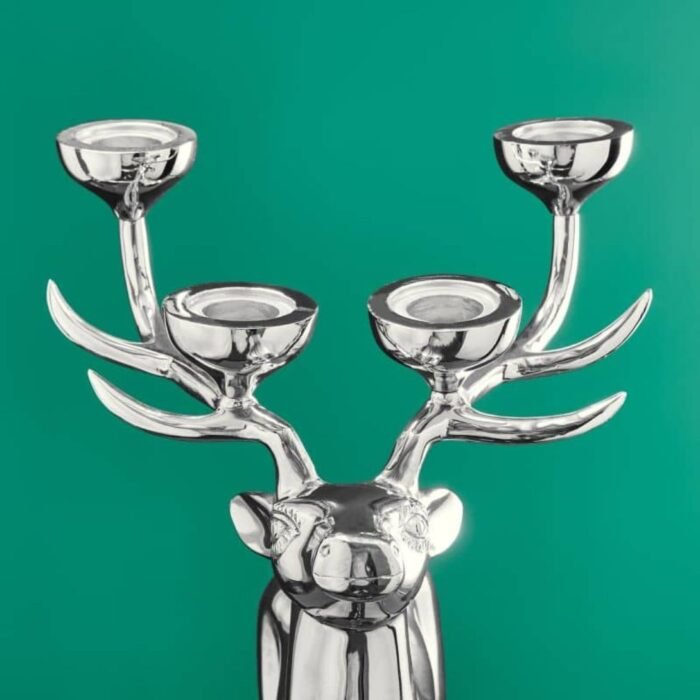 Draped in a gleaming silver tone, this deer-shaped candlestick exudes luxury and sophistication. The cool metallic sheen highlights the detailed form of the deer and its expansive antlers, which serve as candle holders, creating a perfect combination of art and function.