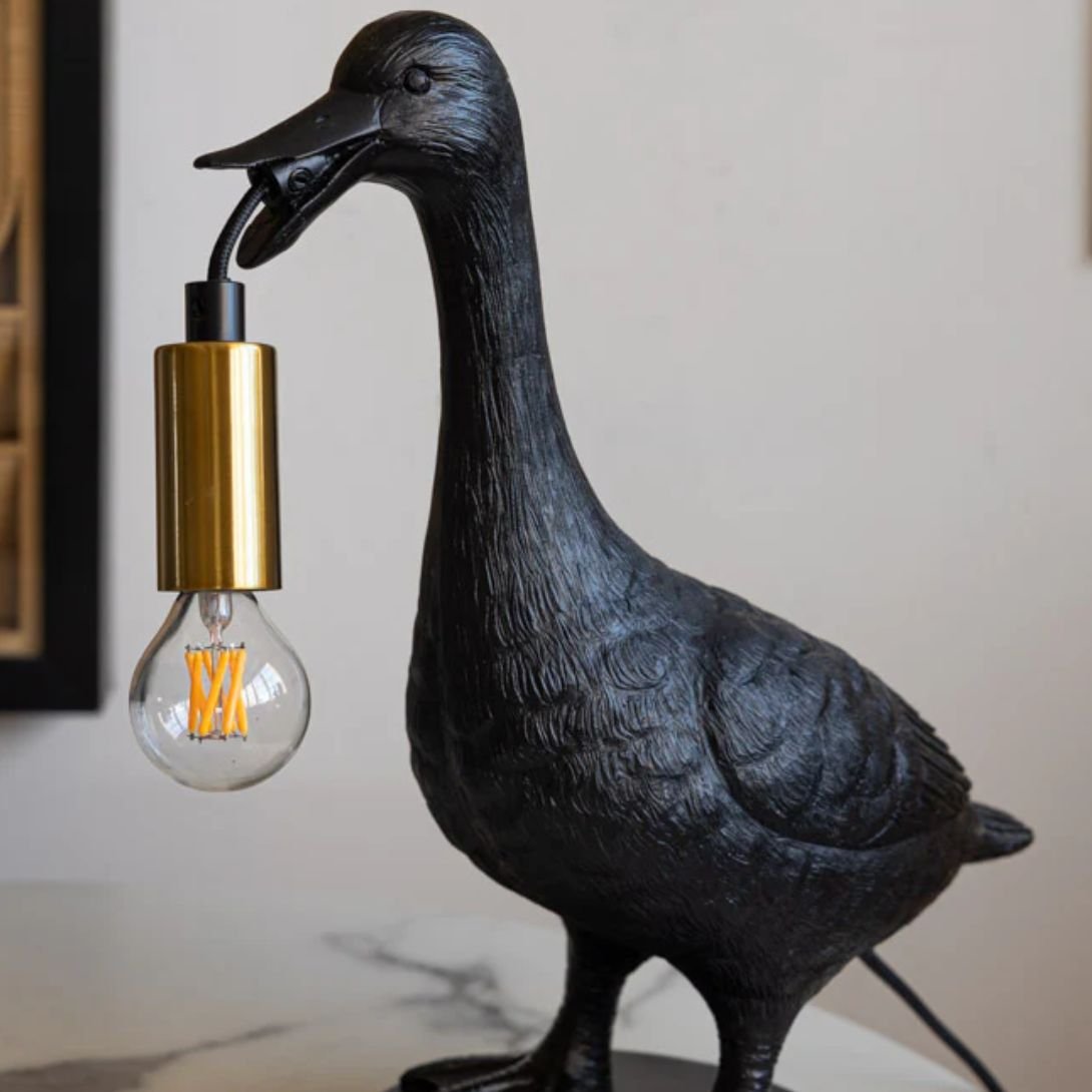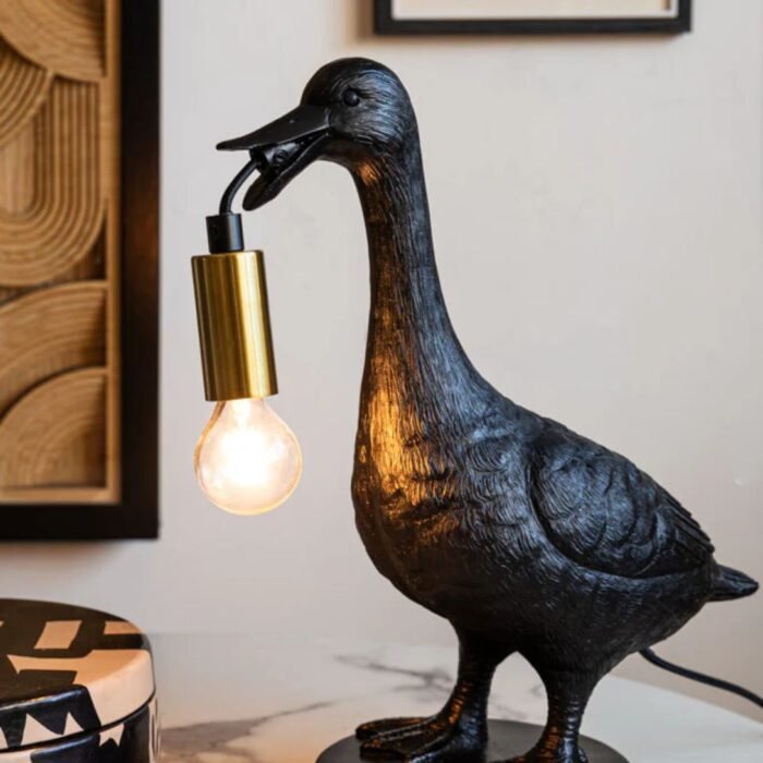 Brighten up your interiors with the Duck Table Lamp—a playful and charming addition that adds both personality and a soft, ambient glow. This unique design captures a curious black duck, cleverly posed to hold the bulb in its beak, as if offering light just for you.