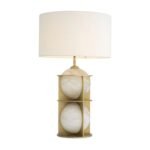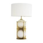 This lamp comes fully equipped with an off-white fabric drum shade, which softens the light and adds to its refined appearance. The shade complements the warmth of the antique brass and the translucency of the alabaster spheres.