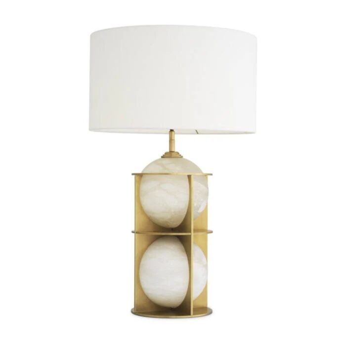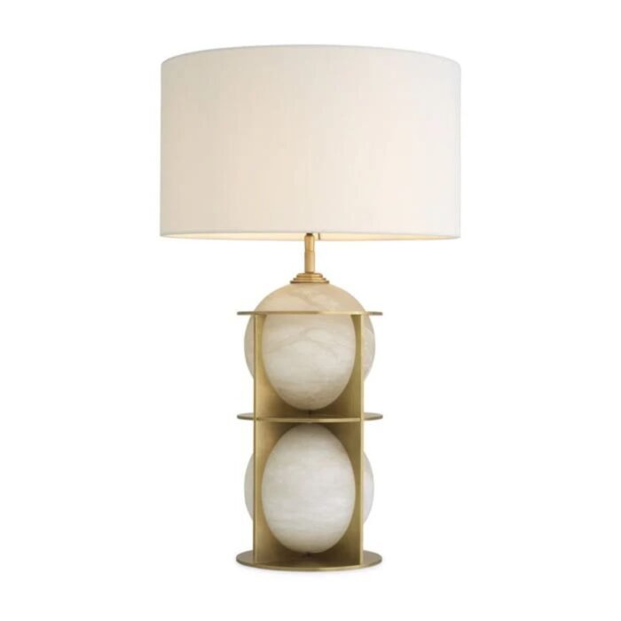 This lamp comes fully equipped with an off-white fabric drum shade, which softens the light and adds to its refined appearance. The shade complements the warmth of the antique brass and the translucency of the alabaster spheres.