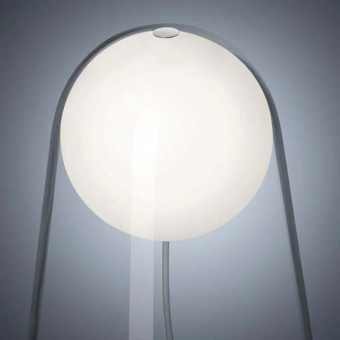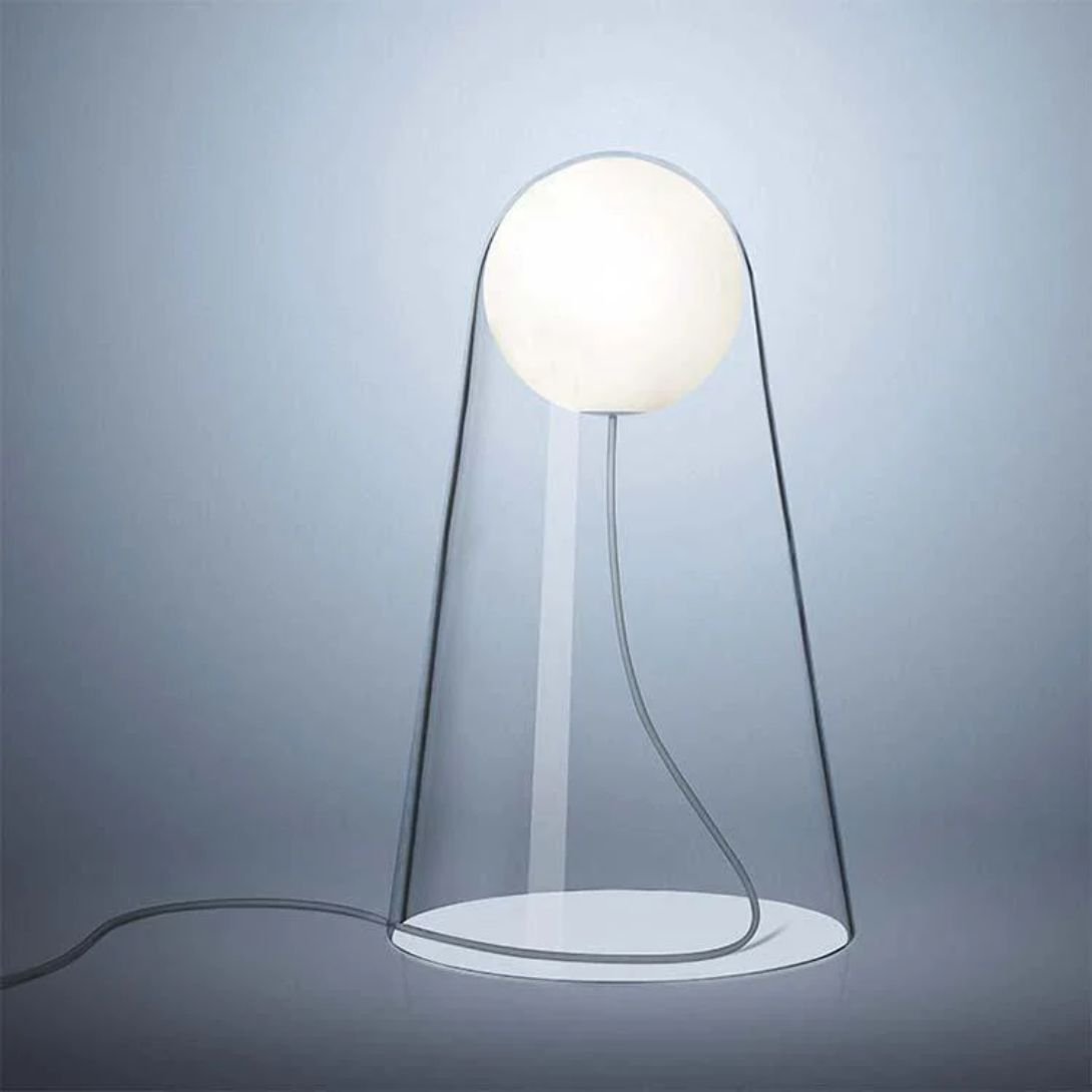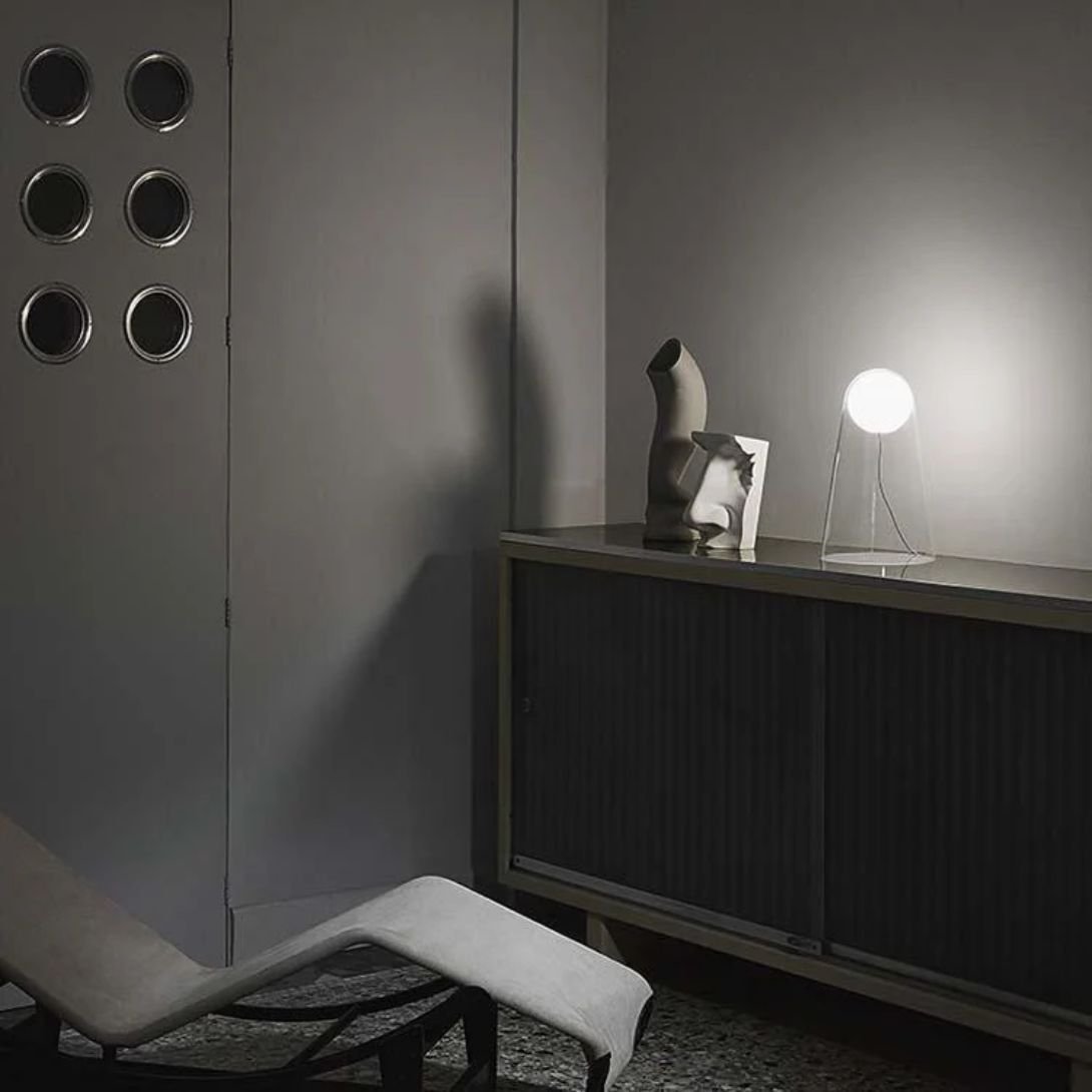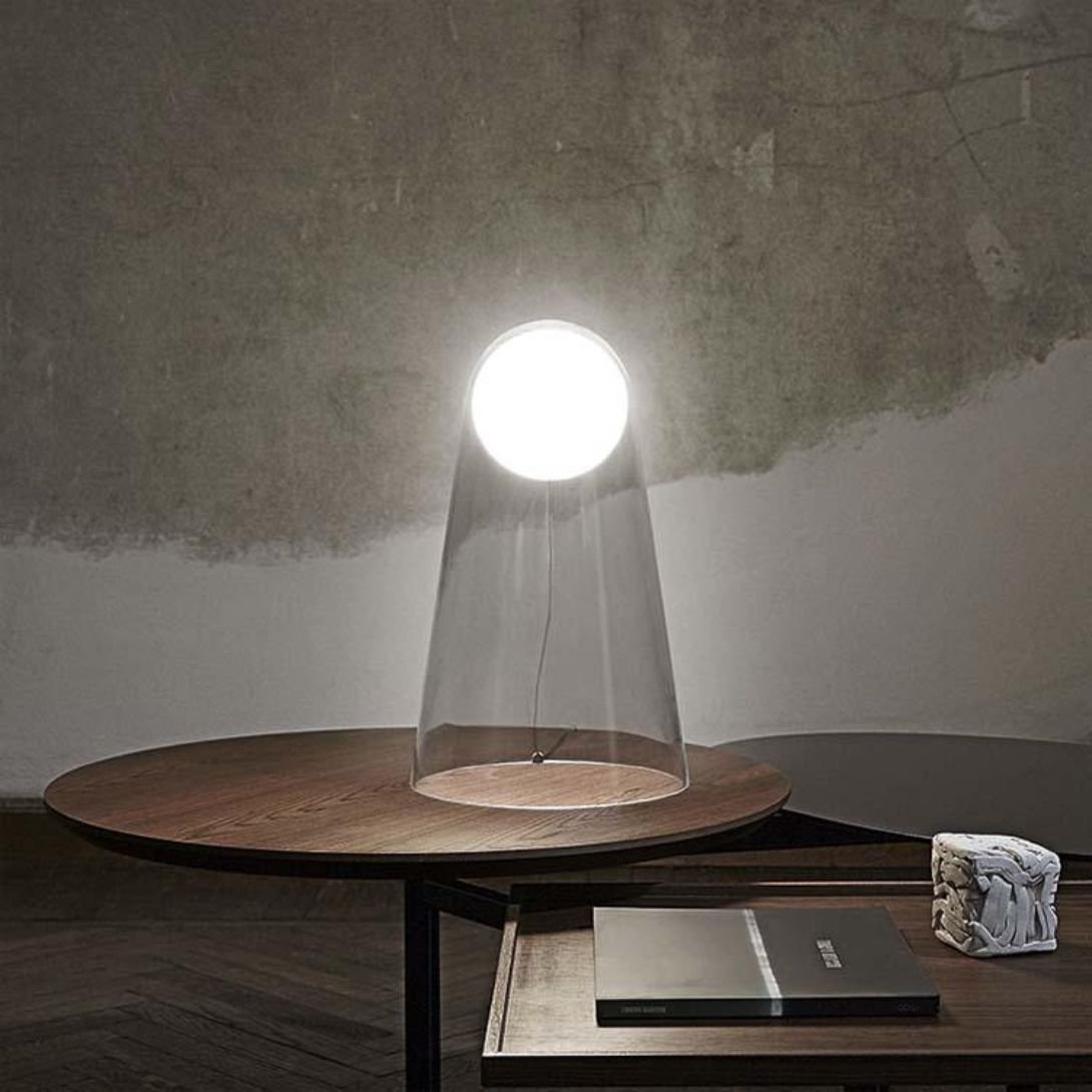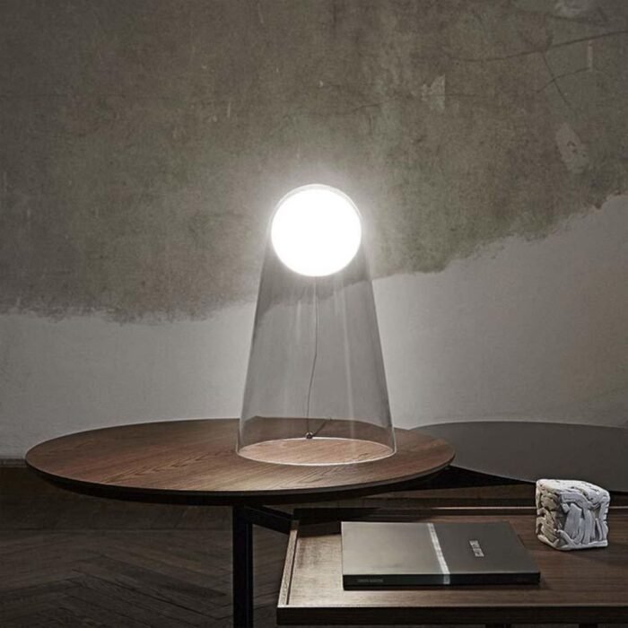 The Satellight Table Light features a striking design with a diffuser crafted from hand-blown milk-white glass, delicately enclosed within a transparent blown-glass body. This composition creates the enchanting illusion of a luminous core floating in mid-air, as if suspended by magic.