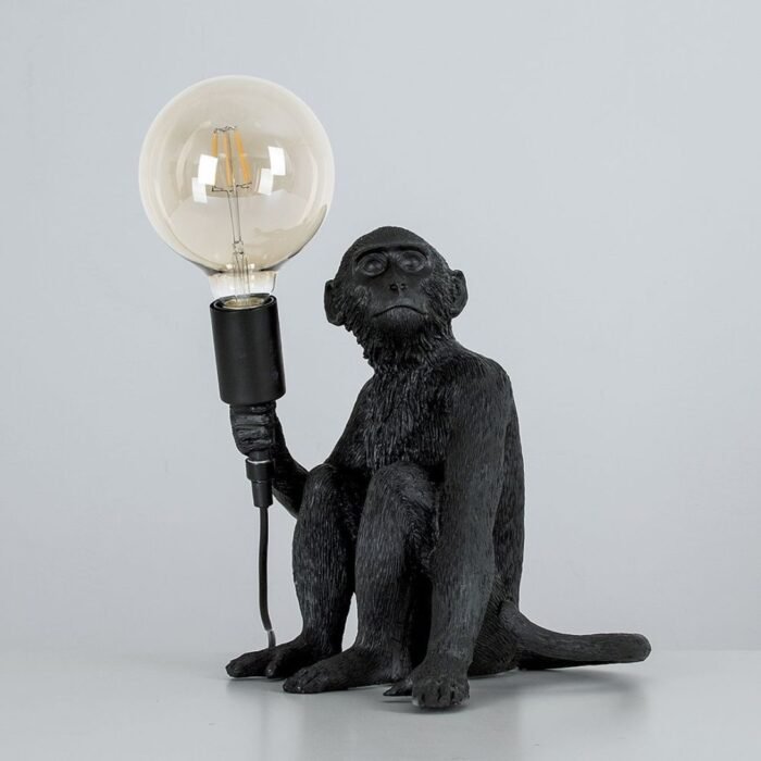 Transform your ordinary space with this distinctive table lamp that perfectly blends modern lighting with a retro flair. Featuring a playful monkey figure holding a light bulb, this lamp is crafted from durable black polyresin, making it both eye-catching and sturdy.