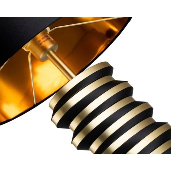Topped with a black fabric shade lined in gold, the lamp casts a warm, ambient glow while adding a refined elegance to any space. The gold interior enhances the warmth of the light, making this piece ideal for living rooms, bedrooms, or stylish office spaces.