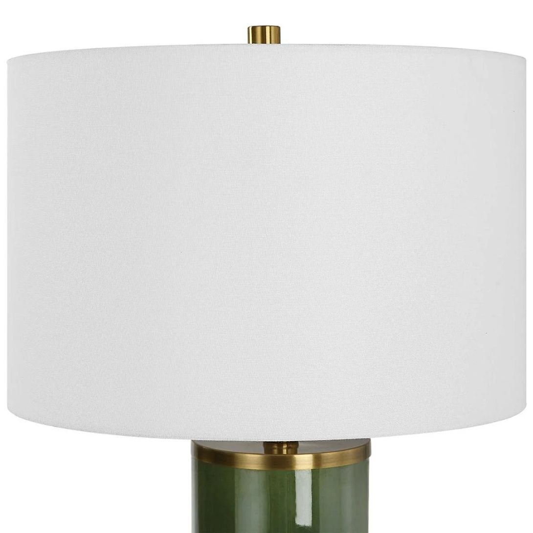 Add depth and sophistication to your home with the Keiichi Lilian Table Lamp in Moss Green. This elegant piece features a rich, dark green ceramic body contrasted by antique gold accents, offering a timeless blend of color and texture. A slim metal band encircles the wide cylindrical base, adding a delicate design detail that softens its bold silhouette.