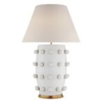 The Linden Table Lamp, designed by the renowned Kelly Wearstler, is a bold statement piece that effortlessly blends humor, texture, and form. Finished in matte white and adorned with whimsical white bobbles, this lamp brings a playful yet sophisticated presence to any interior. Its sculptural silhouette is both artistic and functional, making it a conversation starter in any setting.