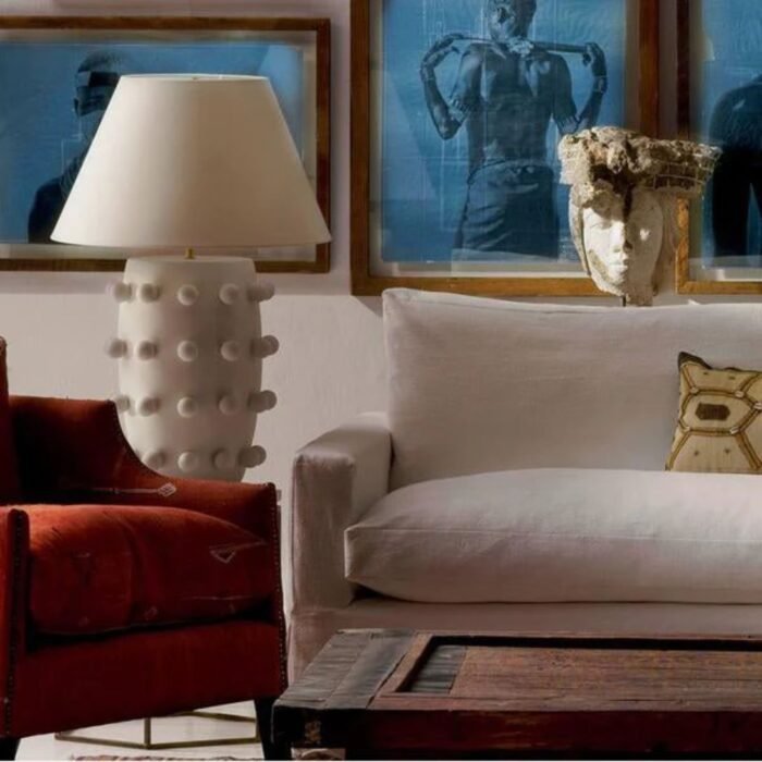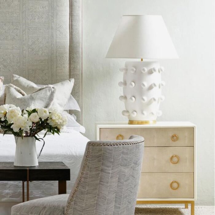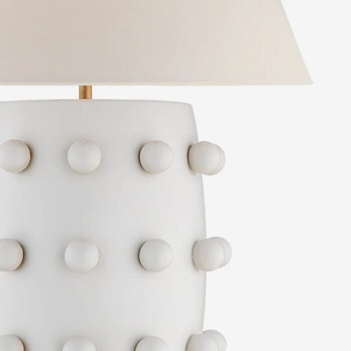 The Linden Table Lamp, designed by the renowned Kelly Wearstler, is a bold statement piece that effortlessly blends humor, texture, and form. Finished in matte white and adorned with whimsical white bobbles, this lamp brings a playful yet sophisticated presence to any interior. Its sculptural silhouette is both artistic and functional, making it a conversation starter in any setting.