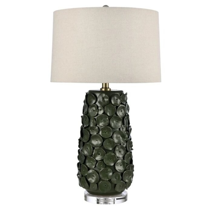 Bring a sense of calm and natural beauty into your home with the Marin Table Lamp, a striking piece that fuses organic inspiration with contemporary design. Its dark green ceramic base, adorned with a circular lily pod pattern, evokes the tranquil rhythm of nature while adding texture and depth to your decor.