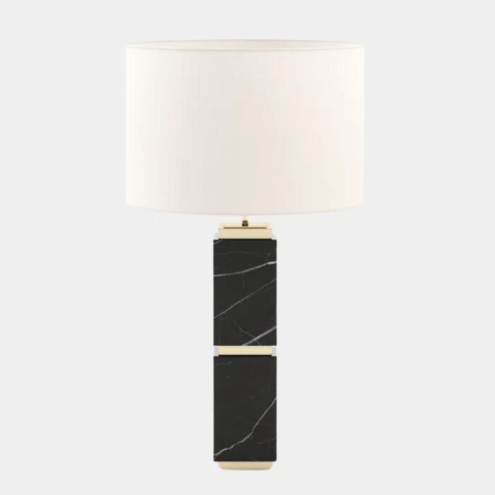 A round lampshade sits gracefully atop the square marble base, creating a visually appealing contrast of shapes. This interplay of geometry adds architectural interest and a contemporary edge to any room.