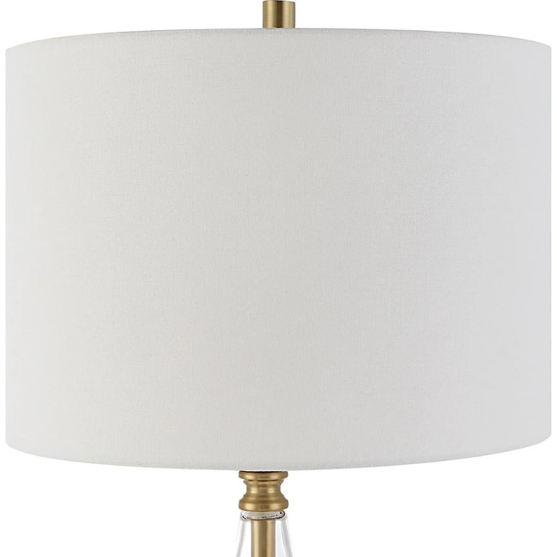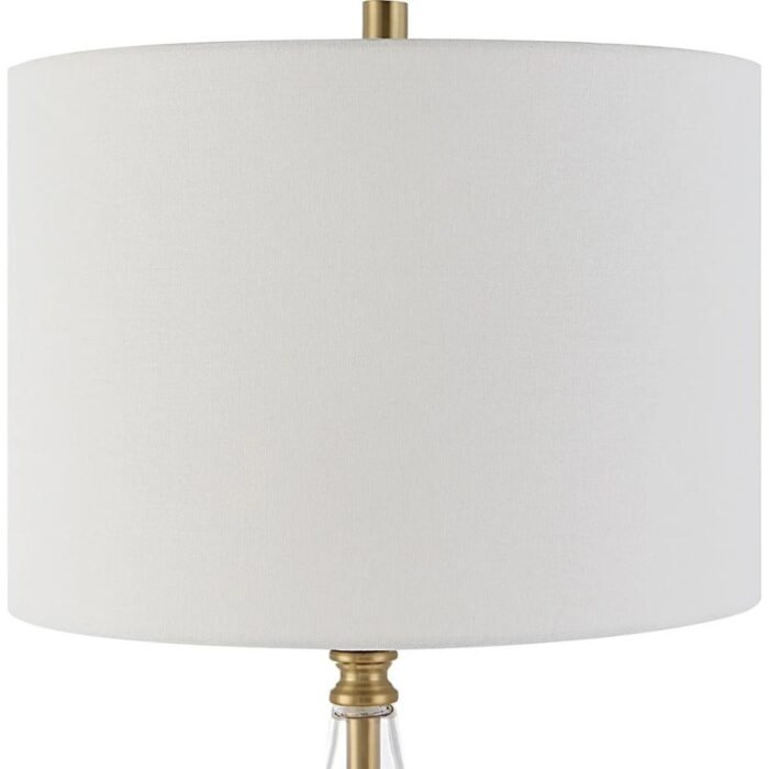Topped with a 14″ round hardback shade crafted from white linen with subtle slubbing, the lamp softly diffuses light to create a warm, inviting ambiance—perfect for bedrooms, living areas, or workspaces. The antique brass finish adds a rich, golden glow, making it an ideal accent piece for those seeking understated luxury.