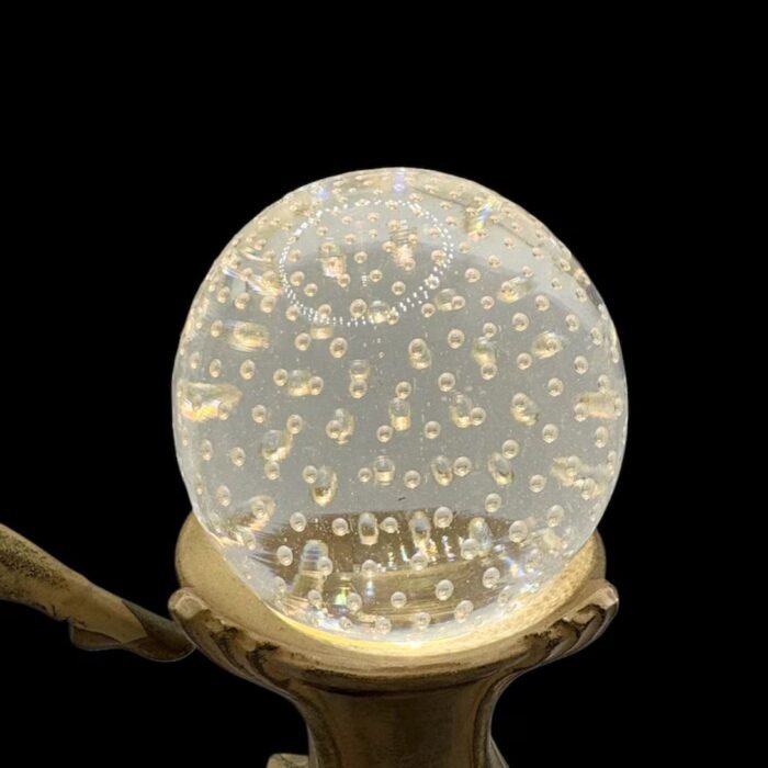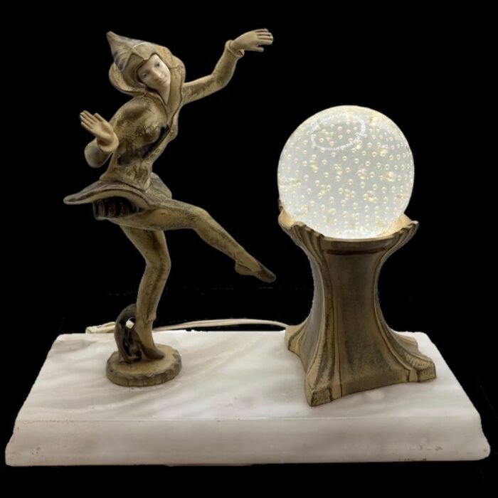 This vintage Art Deco table lamp from the 1920s by J.B. Hirsch Gerdago is a rare and exquisite piece that combines both artistic design and functional lighting. The lamp features a dancing harlequin pixie with intricate detailing, holding a stunning Murano glass ball, set atop a sleek marble base. Its unique and graceful design is a perfect representation of the elegance and style of the Art Deco era.