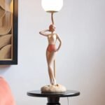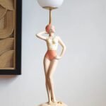 Poised on a sculpted sandy mound complete with a dainty starfish, she’s effortlessly holding her pose while a sleek gold-accented pole rises behind her, supporting a glowing glass globe shade. The result? A lamp that’s part sculpture, part light source, and 100% personality.