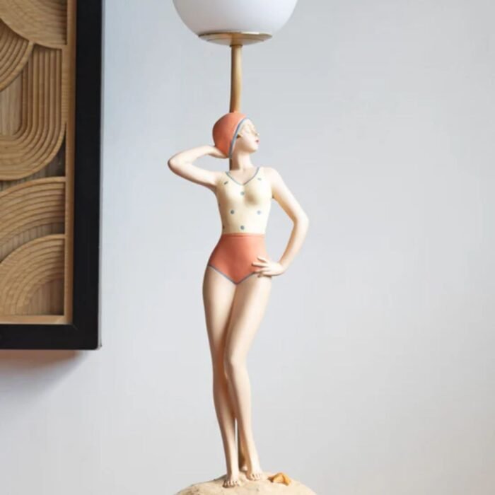 She’s bold, she’s nostalgic, and she’s stealing the spotlight—introducing the Retro-Style Bather Table Lamp with Globe, your new favourite statement piece. Channeling vintage beachside charm, this lamp features a striking bather figurine in a coral and cream retro swimsuit, accented with pale blue for that perfect pop of pastel.
