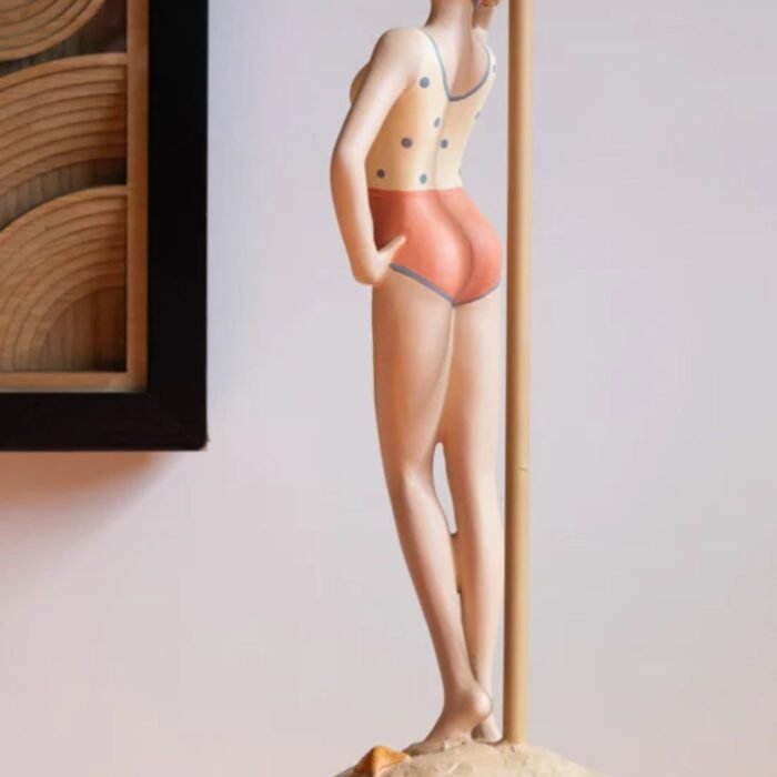 Poised on a sculpted sandy mound complete with a dainty starfish, she’s effortlessly holding her pose while a sleek gold-accented pole rises behind her, supporting a glowing glass globe shade. The result? A lamp that’s part sculpture, part light source, and 100% personality.