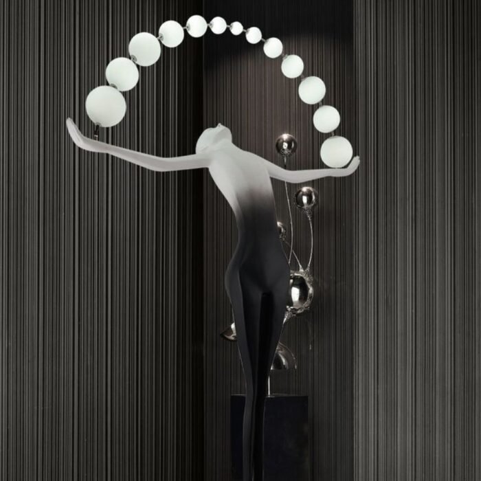 This lamp combines abstract art with lighting, featuring a gracefully posed figure whose arms extend towards an arching line of glowing orbs. The dynamic curve of the orbs creates a sense of motion and elegance, transforming any room with a sense of fluidity.
