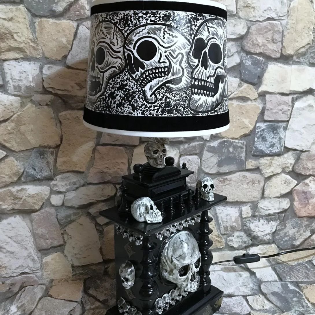 Each skull has been carefully adapted and painted by hand, some even hand-sculpted, making this piece a true artistic standout. The lampshade, also custom-painted and detailed, completes the look—coated in a protective varnish for lasting durability and character.