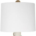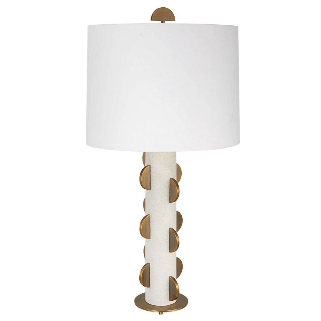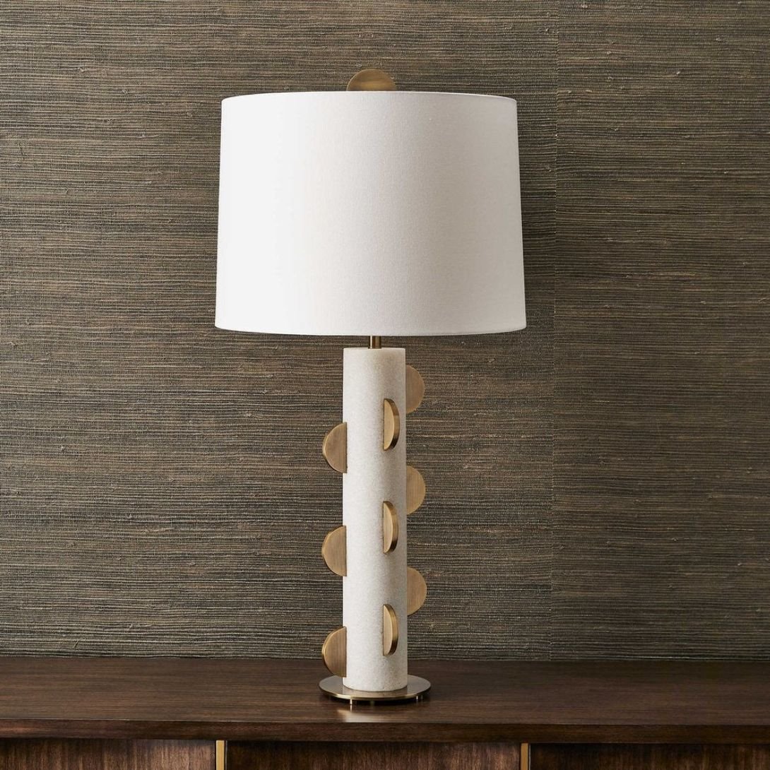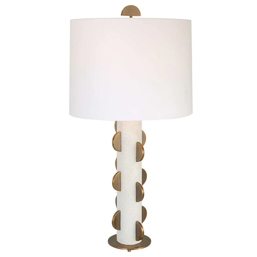 This sophisticated table lamp features half-moons of antique brass spiraling down a white manmade stone column, creating a dynamic interplay of light and warmth. The design is beautifully finished with a half-moon finial, a tapered round hardback shade, and an antique brass base plate with feet, thoughtfully crafted to control and conceal the cord for a clean, polished look.