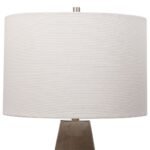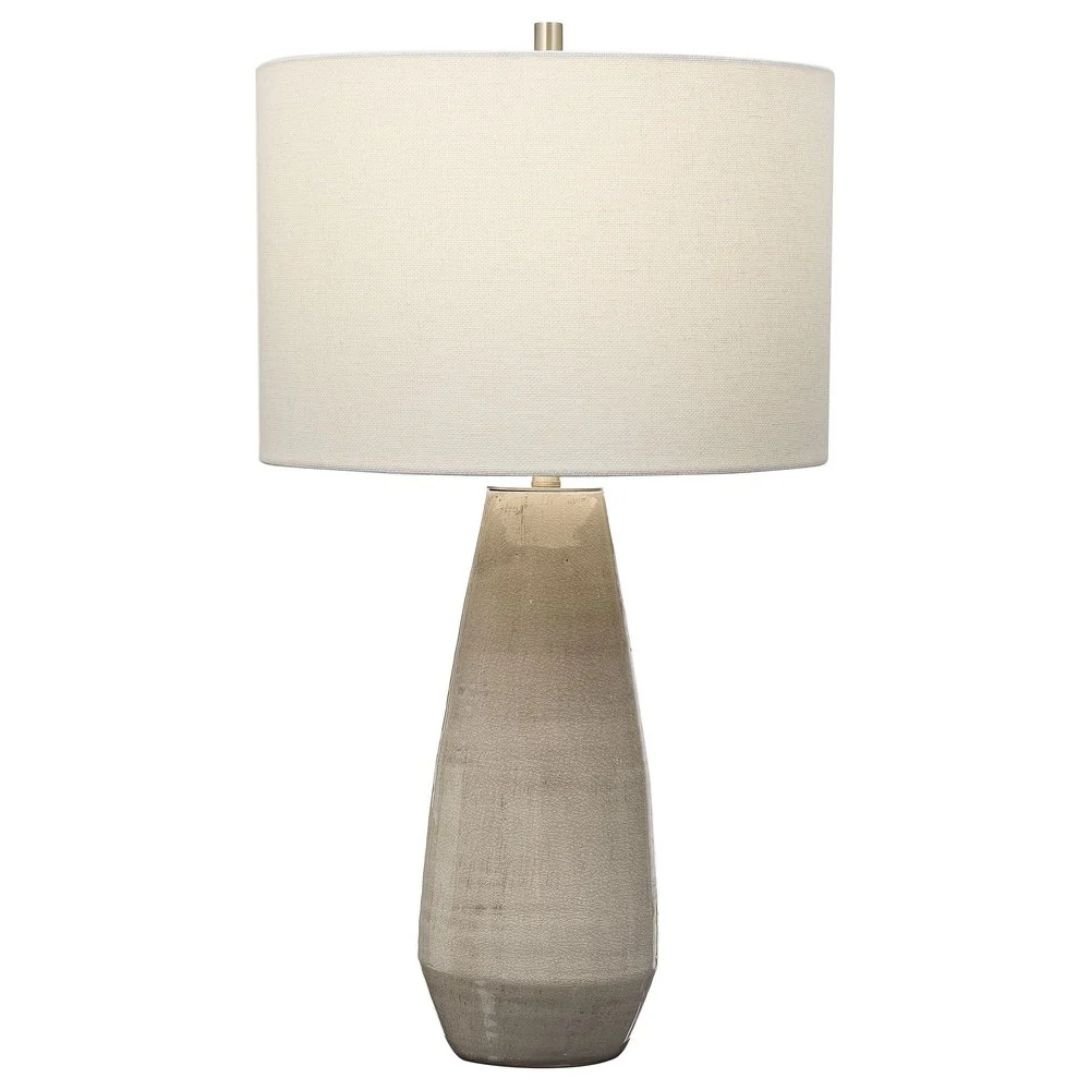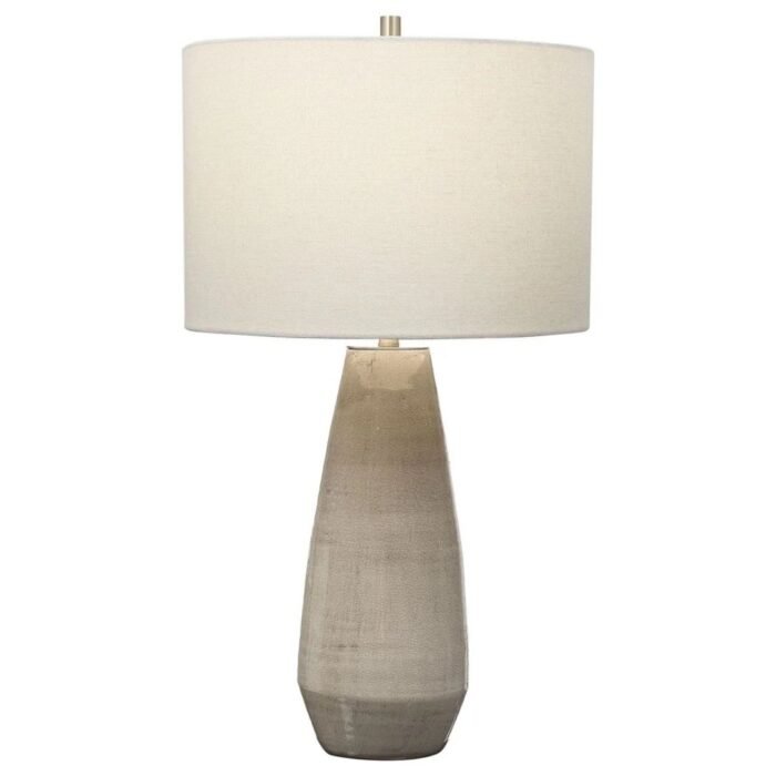 Add subtle texture and timeless style to your space with this ceramic table lamp by Uttermost. Showcasing a beautifully finished crackled taupe-grey glaze, the base features distressed detailing that gives it a naturally aged, artisan look. Complemented by antique brushed brass accents, this lamp combines rustic charm with classic elegance.