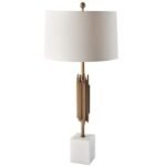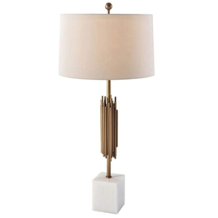 Anchored by a solid white marble plinth base, the lamp exudes elegance and stability. The contrast between the cool, smooth marble and the warm matte brass rods enhances its sophisticated appeal. A cylindrical fabric shade sits atop the lamp, finished with a polished brass finial that ties the entire design together with a touch of classic charm.