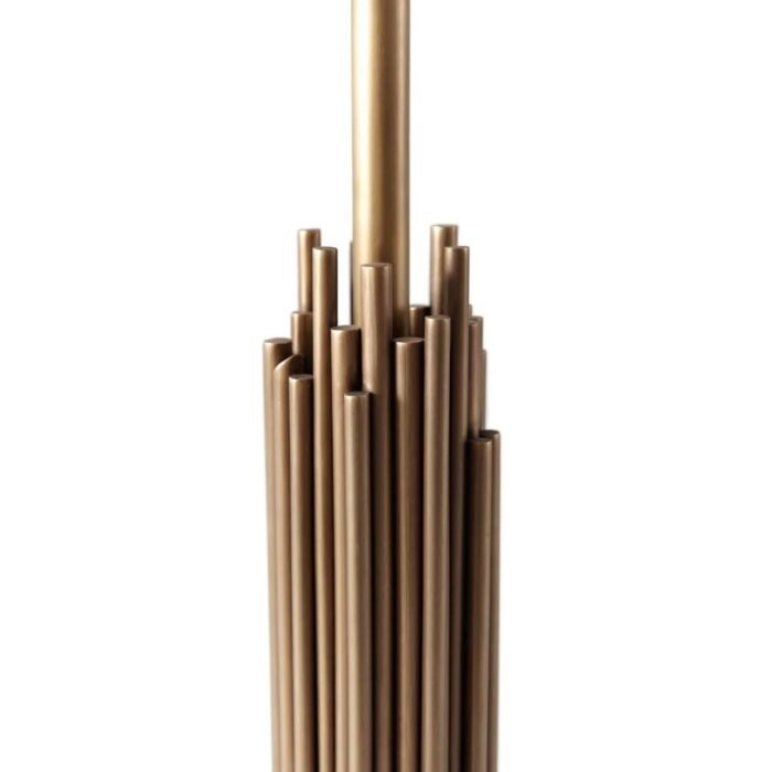 This striking table lamp is a bold blend of modern design and timeless materials. Featuring clustered, offset rods in a rich matte brass finish, it delivers sculptural depth and visual intrigue to any surface. The unique arrangement creates a dynamic form that captures the eye while remaining refined and balanced.